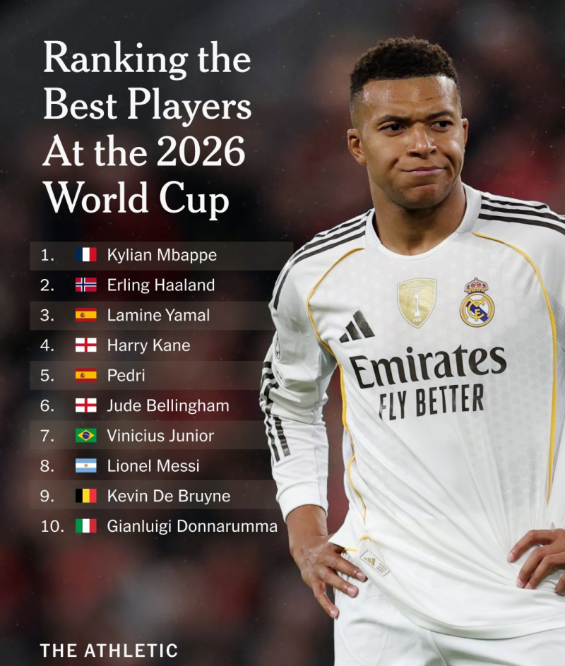 4일 디애슬레틱이 발표한 2026 북중미 월드컵 스타 톱10. 음바페가 이 부문 1위에 올랐다. 메시는 8위, 호날두는 25위였다. 한국 선수 손흥민(37위)만이 명단에 포함됐다. 사진=SNS 이들 뒤로는 잉글랜드 해리 케인(바이에른 뮌헨) 스페인 페드리(바르셀로나) 잉글랜드 주드 벨링엄(레알) 브라질 비니시우스(레알) 등이 차례로 언급됐다.