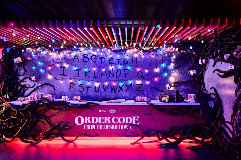 이번 캠페인의 핵심은 시리즈의 세계관을 오감으로 체험할 수 있도록 구현한 팝업 스토어에 있다. KFC는 신촌점 2층에 커튼 하나를 사이에 두고 기묘한 이야기 세계로 진입하는 호킨스 마을로 변신했다. 어둡고 스산한 조명, 음산한 배경 음악, 벽면을 뒤덮은 넝쿨과 괴생명체의 실루엣이 마치 시리즈의 주인공 일레븐이 겪는 미스터리한 일들을 간접적으로 경험하게 한다.