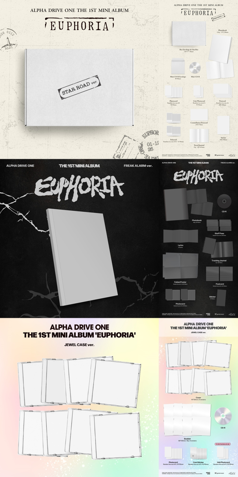 알파브라이브원의 미니 1집 ‘유포리아’의 포토북 버전 2종 ‘스타 로드’ 버전과 ‘프릭 알람’ 버전 그리고 ‘주얼 케이스’ 버전까지 총 3가지 버전이 공개됐다. 패키지 비주얼은 베일에 싸여 있어 궁금증을 더하며 데뷔 앨범의 전체 콘셉트와 신보에 대한 기대감을 끌어올린다. 사진=웨이크원 제공. 공식 데뷔 앨범이자 미니 1집 ‘유포리아’는 각자의 방식으로 꿈을 향해 나아가던 여덟 멤버의 여정이 하나의 팀으로 완성되는 순간을 담는다. 긴 준비 끝에 맞이한 시작의 감정과 벅찬 희열을 알파드라이브원만의 에너지와 서사로 풀어낼 예정이다.