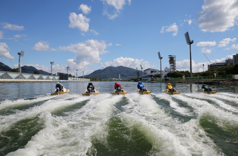 미사 경정장에서 선수들이 계류대를 출발해 경주에 출전하고 있다. 국민체육진흥공단 10년 전 약체로 평가받았던 경정훈련원 13기 선수들이 존재감을 보여주고 있다.