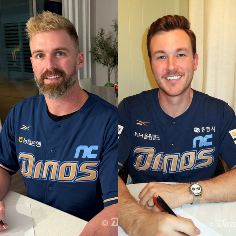 NC 다이노스와 2026년 동행하는 데이비슨(왼쪽)과 톰슨. NC 다이노스 NC 다이노스가 11일 타자 맷 데이비슨 선수, 투수 라일리 톰슨 선수와 재계약했다.