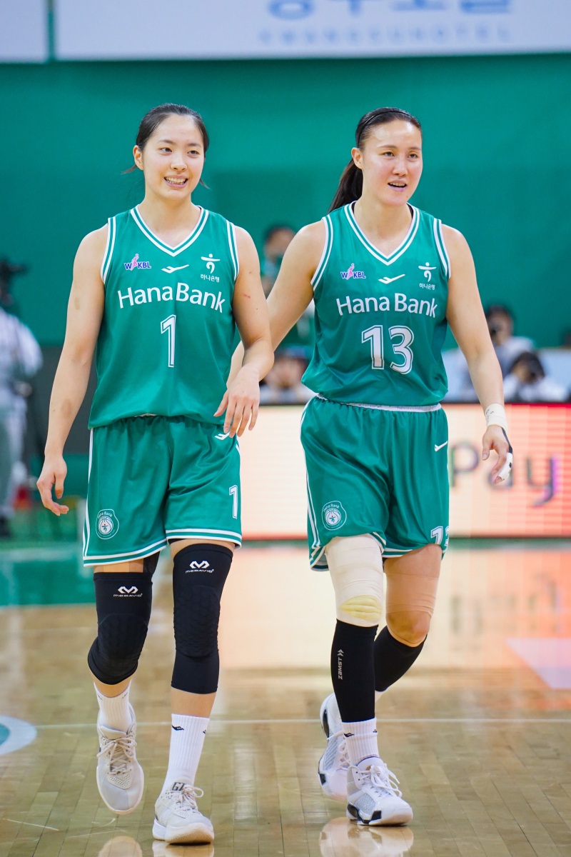 하나은행 박소희(왼쪽)와 김정은이 13일 부천체육관에서 열린 삼성생명과의 BNK금융 2025~26 WKBL 정규리그 홈경기서 승리한 뒤 미소 짓고 있다. 사진=WKBL 김정은은 연승의 기쁨보다 집중력을 먼저 언급했다. 그는 삼성생명전 뒤 방송사 인터뷰서 “농구는 4쿼터까지의 집중력 싸움”이라며 “선수들에겐 연승을 생각하지 말자고 했다. 팀에 어린 선수가 많다 보니 들뜨는 게 있다. ‘우리는 그럴 위치가 아니다’라며 항상 집중하자고 했다”라고 전했다. 하나은행은 지난 시즌 리그 최하위(9승21패)에 그치며 봄 농구를 하지 못했다.