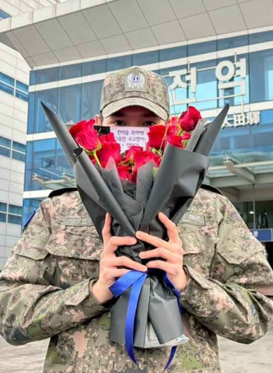 공개된 사진 속 태용은 변함없이 듬직한 자태를 뽐내며 전역 현장에서 군복을 입은 채 굳게 거수경례를 하고 있어 시선을 사로잡았다.