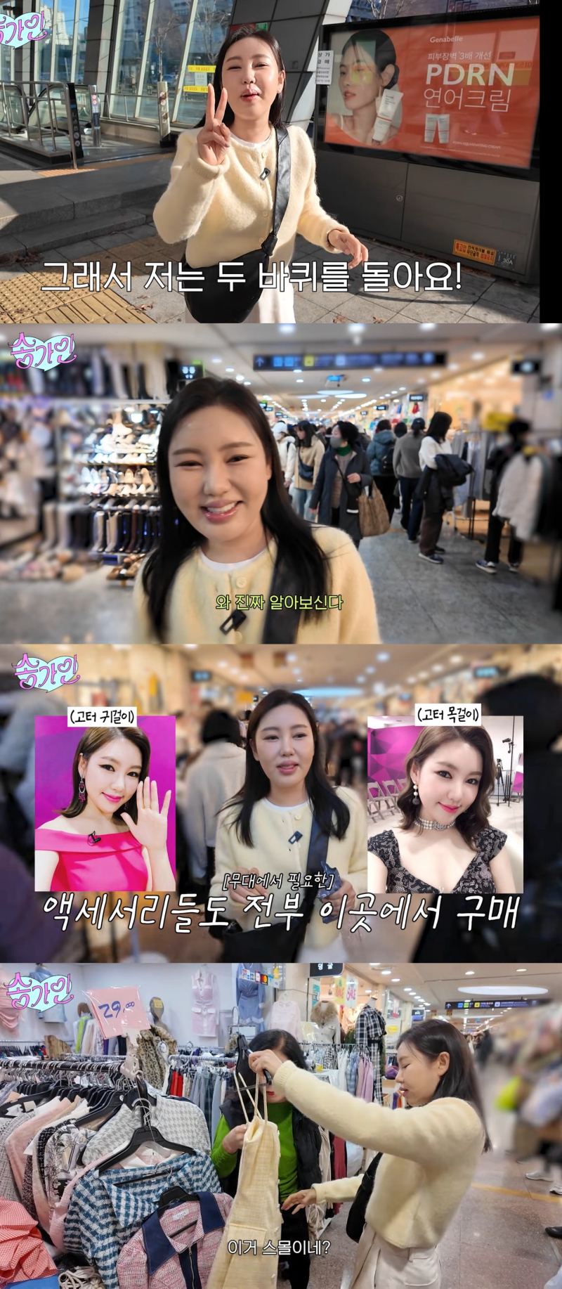 송가인은 “무명 시절 액세서리는 거의 다 여기서 샀다”며 “비싸고 화려한 것보다 가성비 좋은 게 최고”라고 말했다. 그는 “먼저 한 바퀴 아이쇼핑을 하고, 제일 싼 곳에서 산다. 10만 원이면 양손 무겁게 살 수 있다”며 자신만의 쇼핑 노하우도 공개했다.