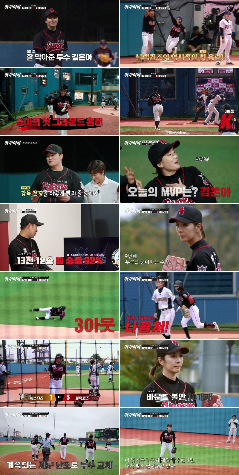 16일 방송한 채널A 스포츠 예능 ‘야구여왕’ 4회에서는 ‘레전드 선출’ 김민지-김보름-김성연-김온아-박보람-박하얀-송아-신소정-신수지-아야카-이수연-장수영-정유인-주수진-최현미가 뭉친 국내 50번째 여자 야구단 블랙퀸즈가 경찰청 여자 야구단과의 첫 경기를 승리로 장식한 데 이어, ‘전국대회 퓨처리그 2회 우승팀’ 버스터즈와 두 번째 정식 경기를 치르는 현장이 공개됐다.
