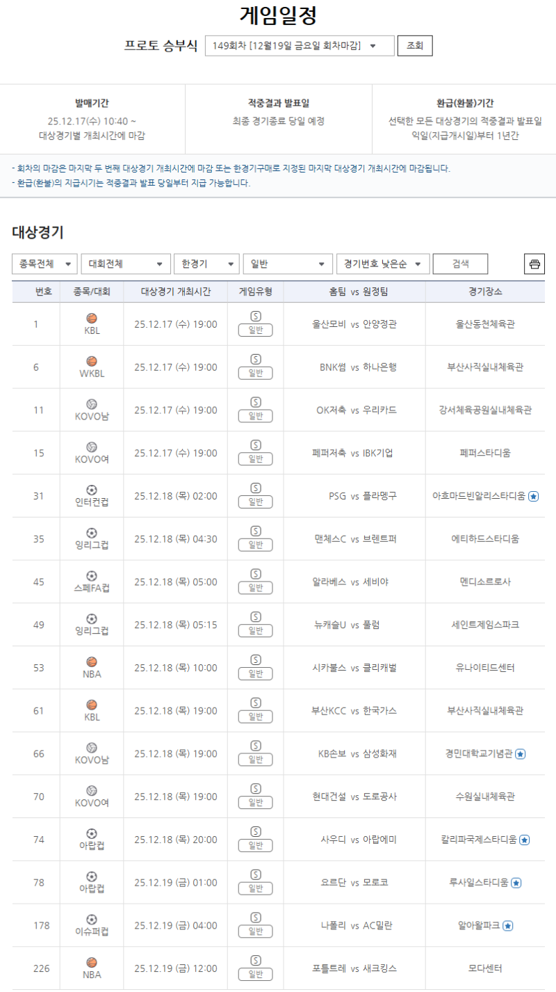 스포츠토토의 프로토 승부식은 100원부터 참여 가능한 조합형 게임과 1,000원부터 이용할 수 있는 ‘한경기구매’ 유형 등으로 구성돼, 연말 시즌 주요 스포츠 경기를 소액으로 즐길 수 있는 상품이다.