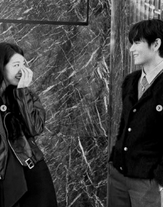 가죽 자켓을 매치해 시크하면서도 세련된 스타일을 선보인 수지는 수줍은 듯 손으로 입을 가리며 웃고 있고, 뷔는 그런 수지를 다정한 눈빛으로 바라보고 있어 마치 청춘 영화의 한 장면을 연상케 한다.