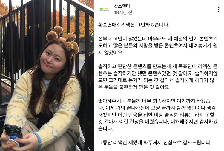 찰스엔터는 “전부터 고민이 많았는데 아무래도 채널의 인기 콘텐츠이기도 하고 많은 분들의 사랑을 받은 콘텐츠여서 내려놓기가 쉽지 않았다”며 “솔직하고 편안한 콘텐츠를 만드는게 제 목표인데 리액션 콘텐츠는 솔직하기만 했던 콘텐츠였던 것 같다. 솔직하지 않으면 그거대로 문제가 되는 것 같아서 솔직하게 하다가 많은 분들을 불편하게 만든 것 같다”고 말했다.