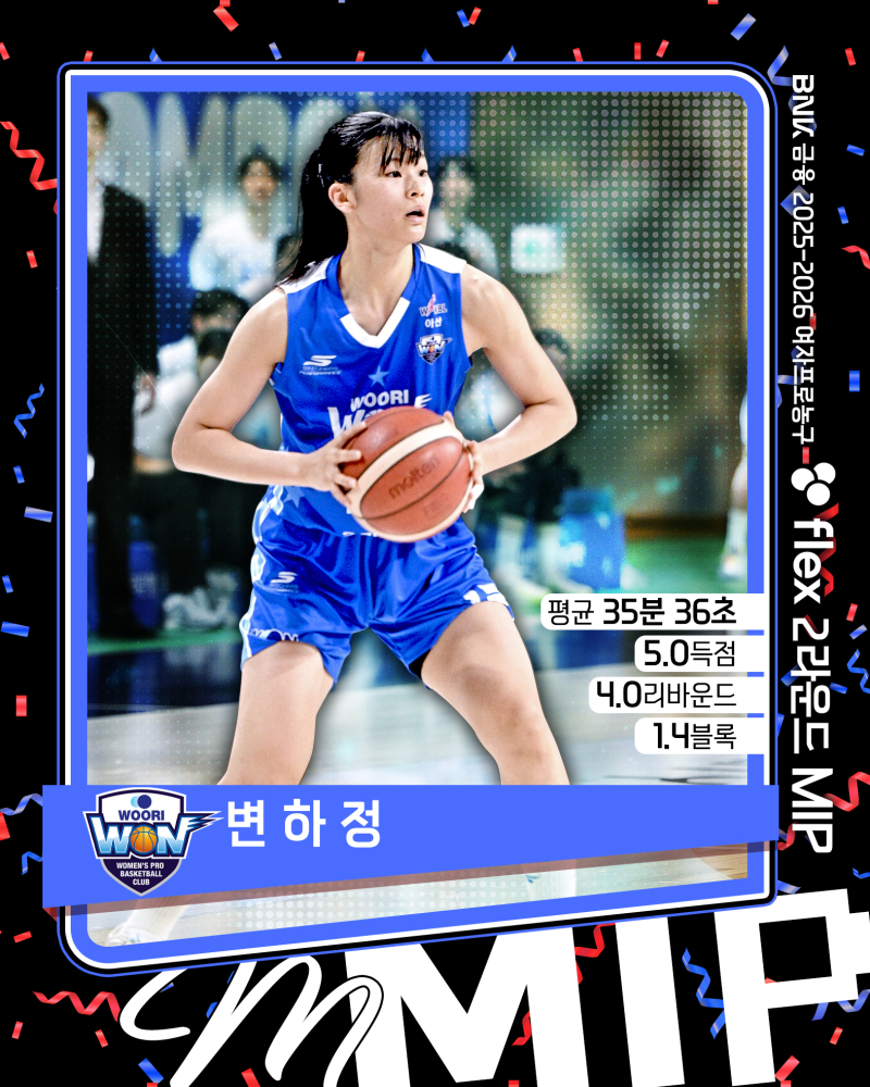 우리은행 포워드 변하정은 개인 통산 첫 번째 라운드 MIP를 품었다. 그는 같은 기간 평균 35분 36초를 뛰며 5.0점 4.0리바운드 1.2어시스트 1.8스틸 1.4블록을 기록했다. 그는 WKBL 심판부, 경기부 투표 36표 중 16표를 획득해 KB 송윤하(14표) 부천 하나은행 박진영(2표) 등을 제쳤다. 변하정은 지난 2023~24시즌 WBKL 신입선수 선발회 1라운드 6순위로 우리은행 유니폼을 입었다.