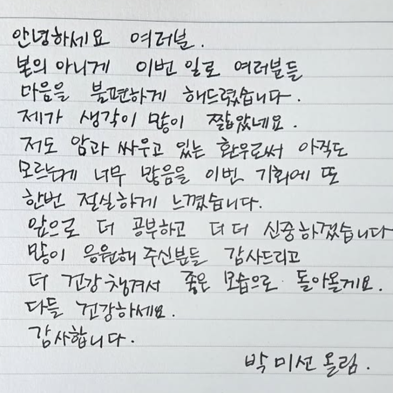 사진=박미선 SNS.사진=박미선 SNS 방송인 박미선이 공동구매(공구) 논란과 관련해 자필편지로 재차 사과했다.