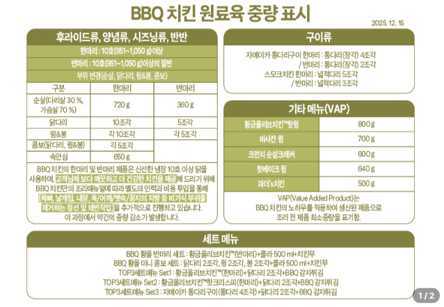 적용 대상은 BBQ치킨·bhc·교촌치킨·처갓집양념치킨 등 국내 치킨 프랜차이즈 상위 10개 브랜드다. 이들 업체는 매장 내 메뉴판은 물론 배달 앱의 정보란에 조리 전 닭고기 중량을 명시해야 한다. 원칙적으로는 g(그램) 단위를 사용해야 하지만, 생닭의 크기가 규격화돼 있는 업계 특성을 고려해 ‘10호(951~1050g)’와 같은 육계 호수 표기도 병행할 수 있도록 허용했다.