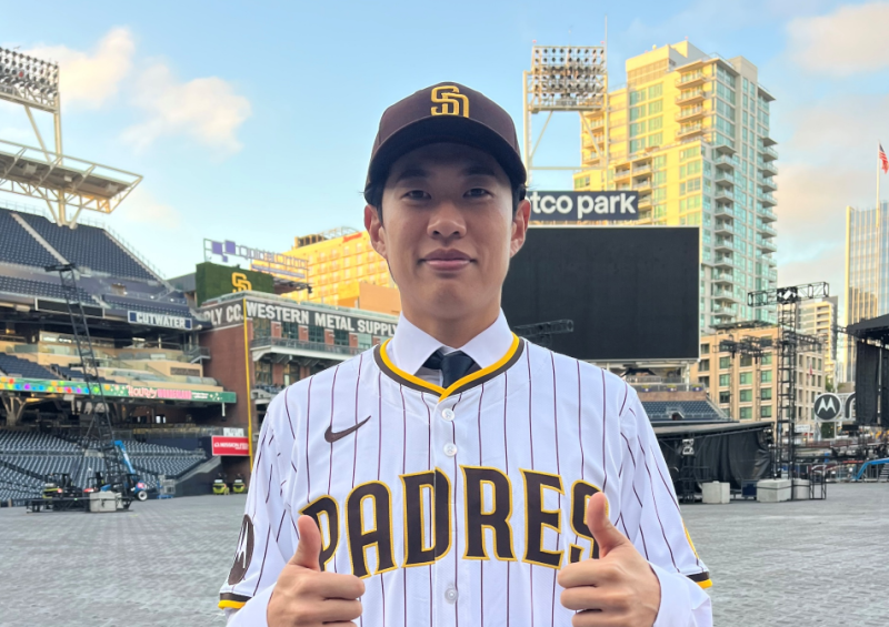 샌디에이고 홈구장 펫코파크에서 새 소속팀 유니폼을 입고 포즈를 취한 송성문. 사진=키움 히어로즈 송성문(29·샌디에이고 파드리스)이 메이저리그(MLB) 최정상급 투수와의 맞대결에 기대감을 드러냈다.