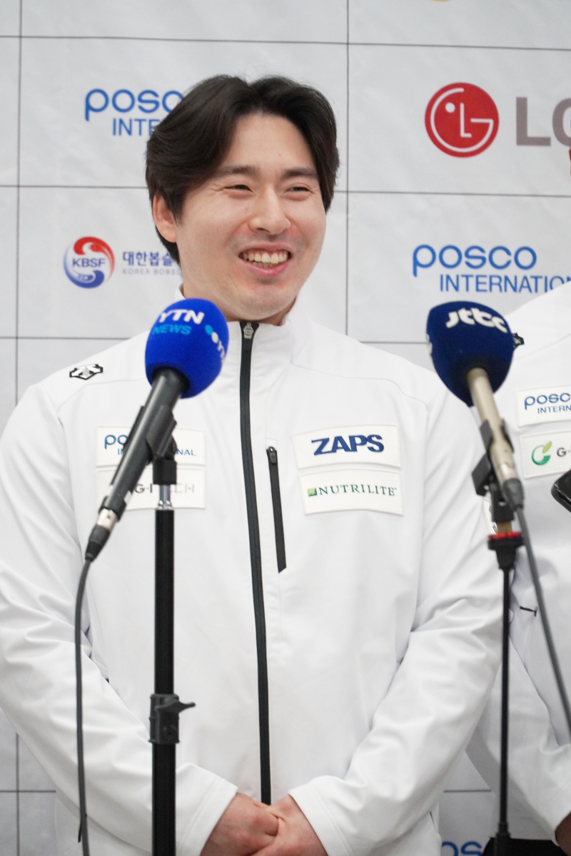 봅슬레이 대표팀 파일럿 김진수가 23일 인천국제공항을 통해 귀국한 뒤 취재진과의 인터뷰서 질의에 답하고 있다. 사진=대한봅슬레이스켈레톤경기연맹 한국 봅슬레이 대표팀 파일럿 김진수(30·강원도청)가 2026 밀라노·코르티나담페초 동계 올림픽을 앞두고 자신감을 드러냈다.