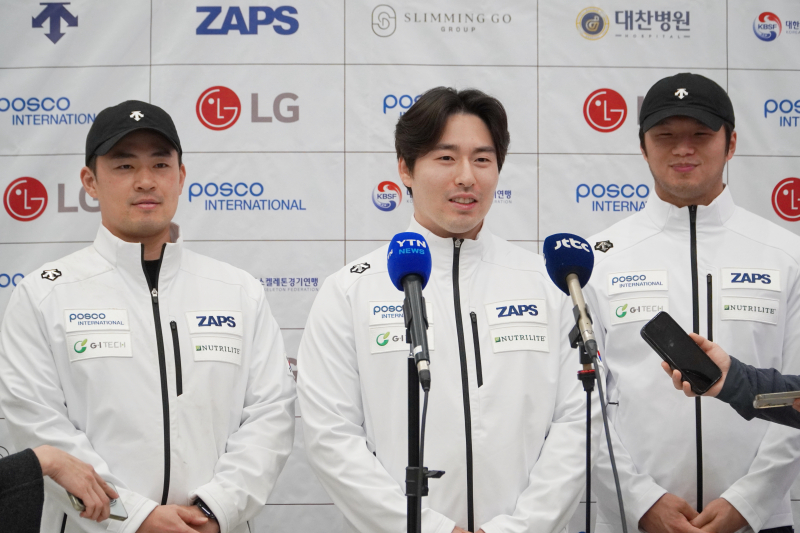 봅슬레이 대표팀 석영진(왼쪽부터) 김진수, 김형근이 23일 인천국제공항을 통해 귀국한 뒤 취재진과의 인터뷰서 질의에 답하고 있다. 사진=대한봅슬레이스켈레톤경기연맹 베테랑 파일럿 석영진 역시 “1번 코너에서 4번 코너로 빠질 때까지의 구간이 있는데, 이 부분을 보완한다면 훌륭한 스타트 기록대로 피니시까지 이어질 거 같다. 충분히 좋은 성적을 낼 가능성이 있다”고 진단했다.