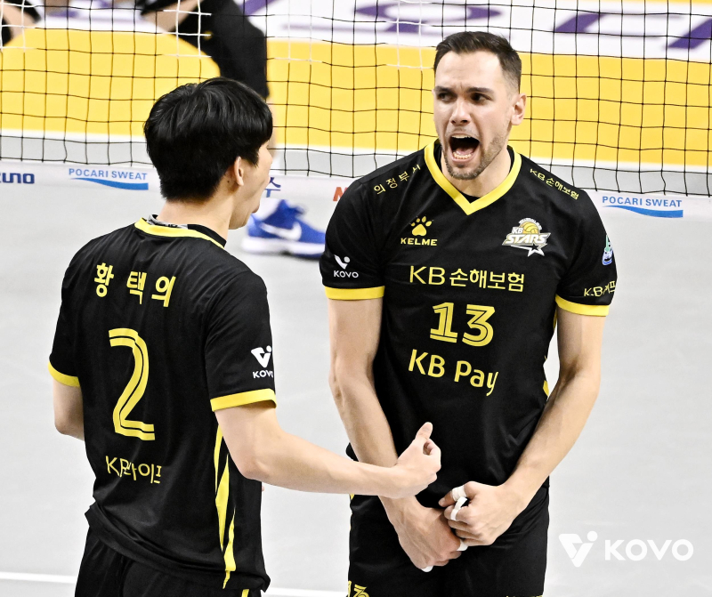 1세트를 내준 KB손해보험은 2세트부터 반격했다. 23-24로 밀린 상황서 임성진의 공격으로 듀스를 만들었고, 이후 상대 연속 범실로 게임의 균형을 맞췄다.