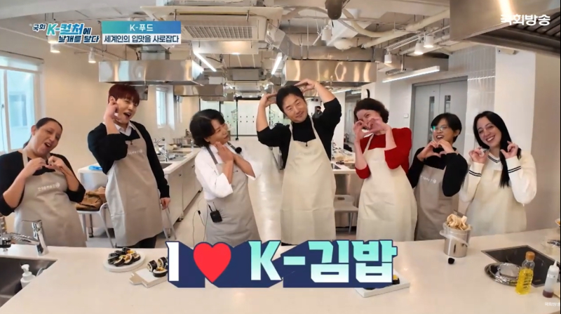 ‘국회 K-컬처에 날개를 달다’의 MC 류승수와 골든차일드 이장준이 외국인 참가자들과 김밥을 만들어 보고 시식하고 있는 모습. 한식진흥원 제공 한식진흥원이 국회방송의 인기 프로그램 ‘국회 K-컬처에 날개를 달다’ K-food편을 통해 한식 체험 기회를 제공했다. 이번 촬영은 한식의 글로벌 확산과 체험형 문화 홍보를 위해 마련되었다.