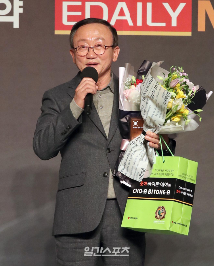 조아제약㈜과 일간스포츠가 공동 제정한 '2022 조아제약 프로야구대상' 시상식이 1일 오전 서울 서대문구 스위스그랜드호텔 그랜드볼룸에서 열렸다. 김덕현 연천군수가 이규성 장충학원 이사장으로부터 허구연장학회 공로상을 받고 소감을 얘기하고 있다. 정시종 기자 /2022.12.01."