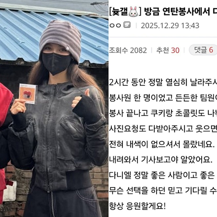 29일 오후 한 온라인 커뮤니티에는 “방금 연탄 봉사에서 다니엘을 만났다”는 후기가 올라왔다. 작성자 A씨는 “2시간 동안 정말 열심히 연탄을 나르며 쉼 없이 움직였고, 든든한 팀원이었다”며 “봉사가 끝난 뒤에는 쿠키와 초콜릿을 나눠주고 사진과 사인 요청도 웃으며 응해줬다”고 전했다.