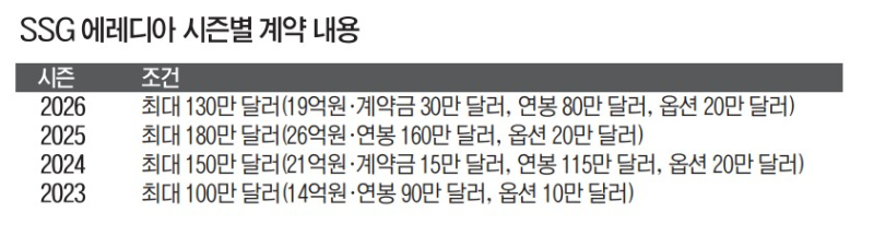 에레디아는 지난 29일 SSG와 최대 130만 달러(19억원)에 재계약했다. 옵션을 제외한 보장 금액은 110만 달러(계약금 30만 달러, 연봉 80만 달러)로 2025시즌 최대 180만 달러(26억원·연봉 160만 달러, 옵션 20만 달러) 규모였던 기존 계약과 비교하면 상당한 삭감을 감수한 셈이다. 보장 금액 기준으로는 약 45%가 줄었다. 외국인 선수 재계약에서 이 정도 폭의 연봉 삭감은 흔치 않다.
