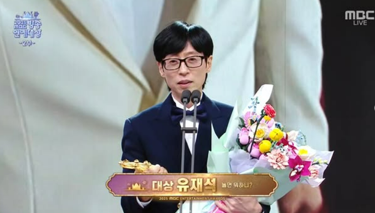 유재석은 ‘2025 MBC 방송연예대상’에서 ‘놀면 뭐하니?’로 대상 트로피를 품에 안았다. MBC에서만 9번째 대상이며, 지상파 3사 ‘연예대상’과 ‘백상예술대상’을 통틀어 통산 21번째 대상 수상이다.
