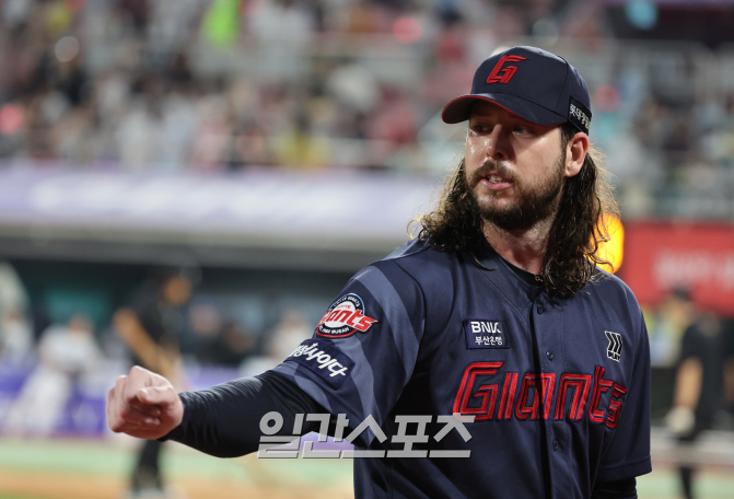 11일 오후 수원 KT위즈파크에서 열린 프로야구 롯데와 KT 경기. 롯데 선발 윌커슨이 5회 KT 공격을 막고 들어가며 동료들과 하이파이브 하고 있다. 수원=정시종 기자 /2024.08.11.
