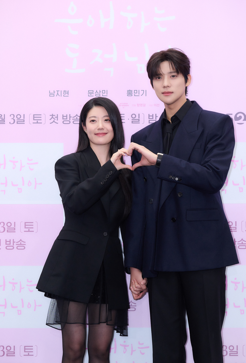 배우 남지현(왼쪽), 문상민이 30일 서울 마포구 상암동에서 열린 KBS2 새 토일드라마 ‘은애하는 도적님아’ 제작발표회에 참석해 포즈를 취하고 있다. ‘믿고 보는 배우’ 남지현과 ‘확신의 대군상’ 문상민이 사극 로맨스로 만났다. 두 배우의 만남이 최근 부진을 겪고 있는 KBS 드라마에 반등의 계기가 될지 관심이 모인다.