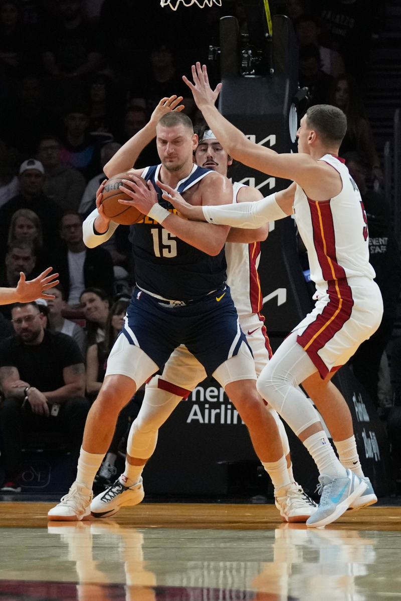 Miami Heat forward Jaime Jaquez Jr., center, rear, and forward Nikola Jovic, right, defend Denver Nuggets center Nikola Jokic (15) during the first half of an NBA basketball game, Monday, Dec. 29, 2025, in Miami. (AP Photo/Lynne Sladky)/2025-12-30 10:40:57/ <저작권자 ⓒ 1980~2025 ㈜연합뉴스. 무단 전재 재배포 금지, AI 학습 및 활용 금지>