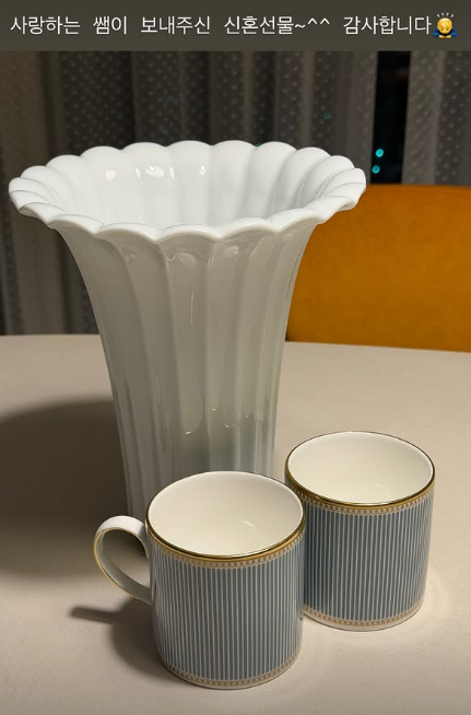 공개된 사진 속엔 길쭉한 꽃 형태의 우아한 화분과 금테가 둘러진 파란 스트라이프 커플 머그컵 한 쌍이 테이블 위에 놓여져있다. 온주완과 방민아의 신혼집으로 추정되는 이 공간 뒤로는 도트 무늬 레이스 소재 커튼이 함께 담겨 아기자기한 분위기를 엿보이게 한다. 사진=온주완 SNS