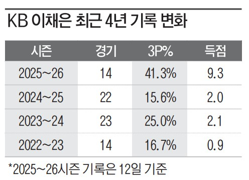 이채은은 지난 11일 열린 2025~26 여자프로농구(WKBL) 용인 삼성생명전에서 3점슛 6개를 시도해 3개를 성공, 89-73 승리에 힘을 보탰다. 이 경기로 시즌 3점슛 성공률을 41.3%(19/46)까지 끌어올린 그는 정현(부천 하나은행·40.7%)을 제치고 해당 부문 리그 1위로 올라섰다. 국가대표 출신 외곽 슈터이자 팀 내 베테랑인 강이슬의 3점슛 성공률이 30.5%(리그 평균 28.71%)에 그치고 있는 점을 감안하면, 이채은의 기록은 더욱 눈길을 끈다.