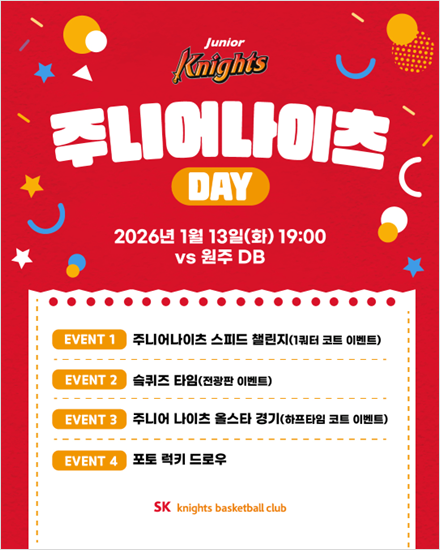 SK는 오는 13일 서울 잠실학생체육관에서 원주 DB와 2025~26 LG전자 프로농구 정규리그 홈 경기를 벌인다. 이 경기 하프타임에는 ‘주니어 나이츠 올스타 경기’를 개최할 예정이다.