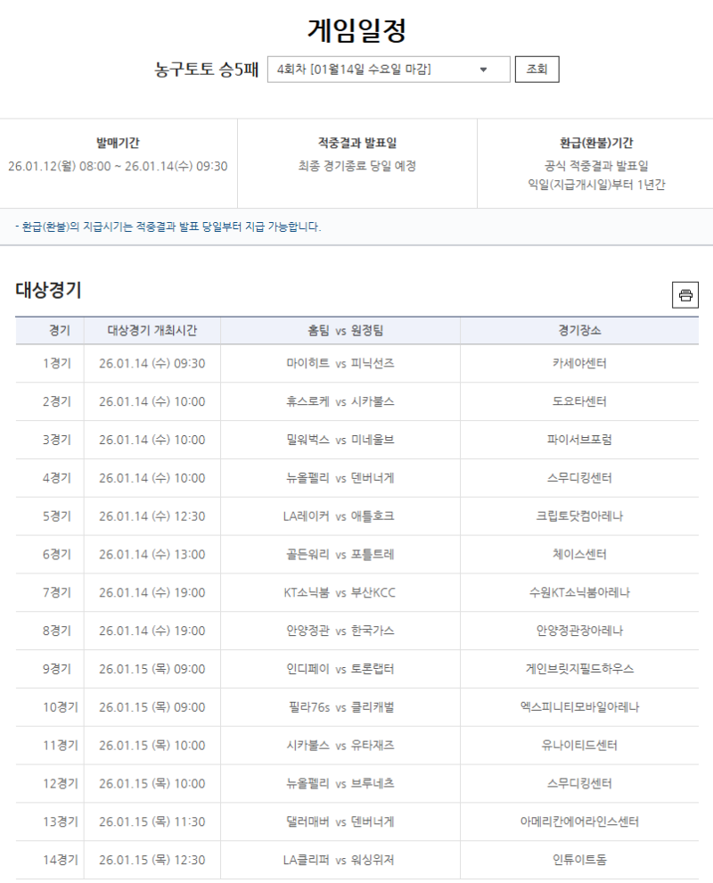 한편, 현재 발매 중인 농구토토 승5패 4회차에는 ▲마이애미 히트-피닉스 선즈 ▲밀워키 벅스-미네소타 팀버울브스 ▲LA 레이커스-애틀랜타 호크스 ▲골든스테이트 워리어스-포틀랜드 트레일블레이저스 등 NBA 주요 경기와 함께 ▲KT 소닉붐-부산 KCC ▲안양 정관장-한국가스공사 등 KBL 핵심 매치업이 포함돼 있다.