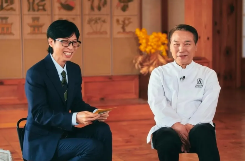공개된 사진 속 후덕죽 셰프는 특유의 온화한 미소를 지은 채 하얀 조리복 차림으로 자리에 앉아 있으며, MC 유재석 역시 환한 표정으로 만남을 즐기는 모습이 담겼다.