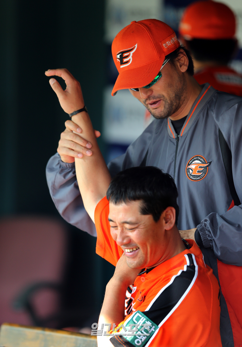 한화 박찬호가 잠실야구장에서 LG와의 경기 중 김민재 코치의 어깨을 마사지 해주고 있다. [사진 일간스포츠]