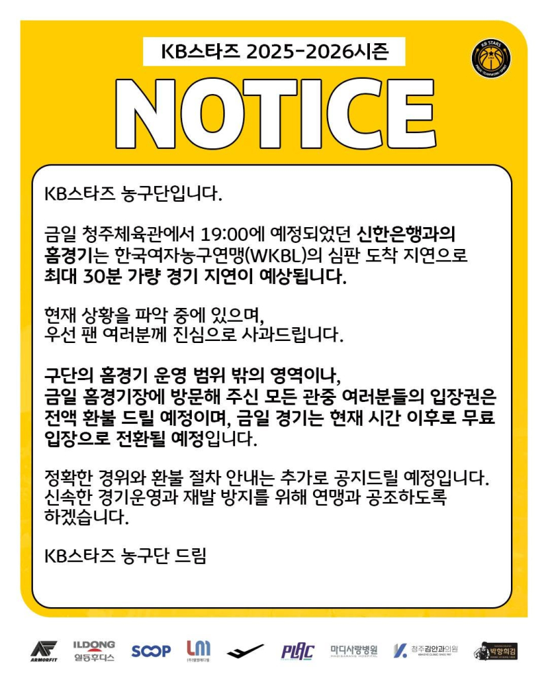 16일 경기 지연으로 인해 입장권 전액 환불 공지를 게시한 KB. 사진=KB SNS 여자프로농구(WKBL) 정규리그 경기가 심판진의 지연 도착으로 미뤄지는 초유의 사태가 벌어졌다. 대신 대한민국농구협회 소속 아마추어 심판이 휘슬을 잡은 거로 알려졌다. 이들 모두 지난 시즌 WKBL 경험이 있는 심판이다.