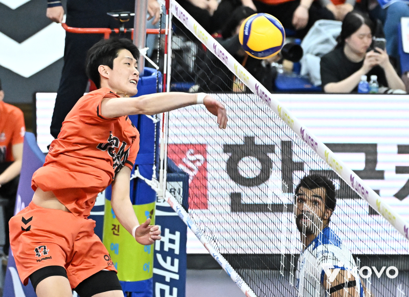 OK저축은행 박창성이 속공을 하고 있는 모습. 사진=KOVO OK저축은행이 혈전 끝에 삼성화재를 꺾고 4위로 올라섰다.