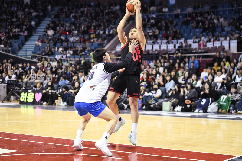 SK 에디 다니엘이 18일 서울 잠실실내체육관에서 열린 2025~26 LG전자 프로농구 올스타전 1대1 콘테스트에서 삼성 정성조를 상대로 슛을 시도하고 있다. 그는 이날 정성조를 11-2로 물리치고 이 대회 초대 챔피언이 됐다. 사진=KBL