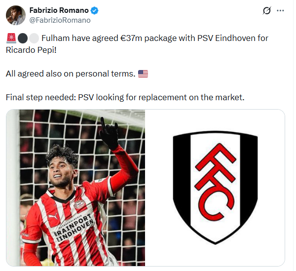 2일 풀럼의 PSV 리카르도 페피에 대한 이적 합의 소식을 전한 로마노 기자. 사진=로마노 SNS 같은 날 CBS 스포츠도 ESPN 보도를 인용하며 “풀럼은 페피 영입을 위해 이전 제안보다 조건을 개선했다. 가장 최근 제안은 3800만 달러(약 555억원)였다. 페피의 거래는 PSV가 대체할 선수를 마련하는지에 따라 달려 있다”고 조명했다.