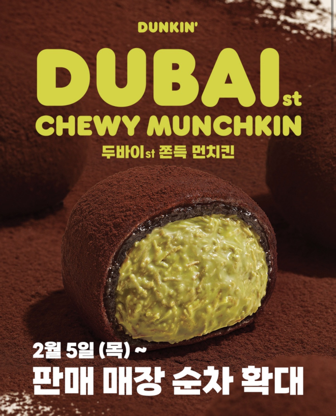 비알코리아가 운영하는 던킨이 신제품 '두바이st 쫀득 먼치킨(두쫀먼)'을 일부 매장에서 선보인지 일주일 만에 전국 가맹점으로 두바이 트렌드를 확대한다.