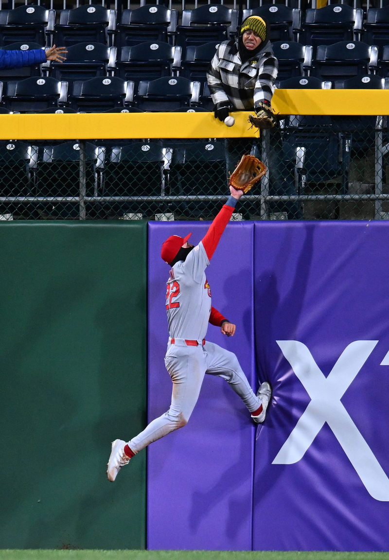 PITTSBURGH, PENNSYLVANIA - APRIL 7: Michael Siani #22 of the St. Louis Cardinals can't make a catch on a ball off the bat of Joey Bart of the Pittsburgh Pirates (not pictured) that went for an RBI triple during the seventh inning at PNC Park on April 7, 2025 in Pittsburgh, Pennsylvania. After reviewing the play, a fan was called for fan interference but the play still resulted in a triple. Joe Sargent/Getty Images/AFP (Photo by Joe Sargent / GETTY IMAGES NORTH AMERICA / Getty Images via AFP)/2025-04-08 10:33:08/ <저작권자 ⓒ 1980~2025 ㈜연합뉴스. 무단 전재 재배포 금지, AI 학습 및 활용 금지>