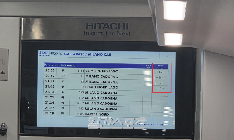 첸트랄레행 기차도 문제였다. 애초 예상 소요 시간은 40분 안팎이었으나, 실제로는 100여 분이 소요됐다. 밀라노 인근의 사로노 역에서 운영 지연이 생긴 탓이었다. 구체적인 방송 없이, 한 정거장에서만 30분 넘게 정차하는 답답한 상황을 마주했다. 스크린을 통해 앞선 열차들이 최대 40분까지도 지연된 사실을 접할 수 있었다. 경비를 위해 투입된 탑승객들의 여권을 확인하기도 했다.