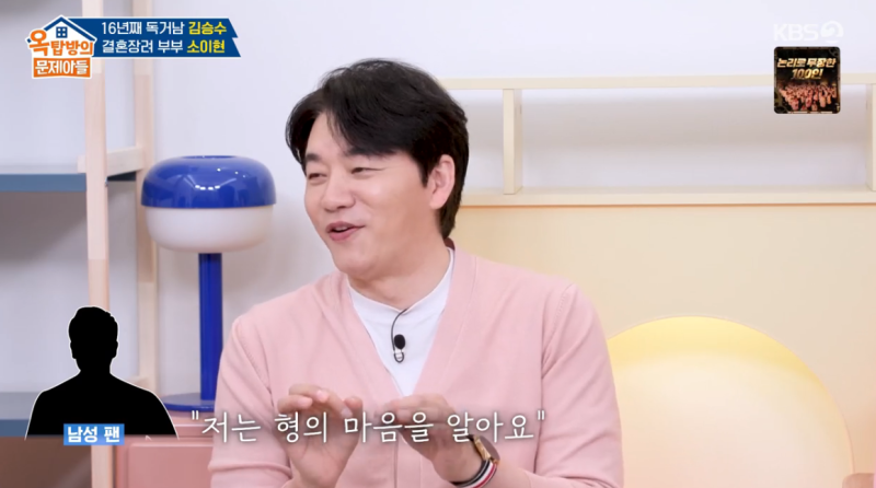 그러자 김승수는 “여기서 확실히 말씀드리는데 혼자 오래 있다 보니까 다양한 생각을 하시는 분들이 있다”면서 “그중 한 남성 팬에게 편지를 받았는데 ‘형, 저는 형의 마음을 알아요. 저한테만 털어놓으셔도 돼요’라고 하더라”라고 말문을 열었다.