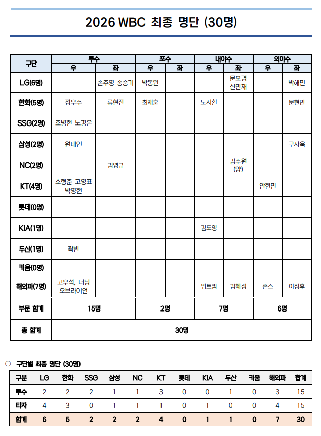 류지현 감독이 이끄는 야구대표팀은 3월 5일부터 열리는 2026 WBC 본선 1라운드 C조에서 일본, 대만, 호주, 체코와 경쟁한다. 경기는 일본 도쿄에서 치러진다. 최종 엔트리는 투수 15명, 포수 2명, 내야수 7명, 외야수 6명으로 꾸려졌으며 관심이 쏠린 한국계 선수는 라일리 오브라이언(세인트루이스 카디널스) 셰이 위트컴(휴스턴 애스트로스) 저마이 존스(디트로이트 타이거스) 데인 더닝(시애틀 매리너스) 등 4명이 포함됐다.