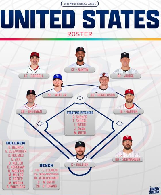 미국 야후스포츠는 6일(한국시간) '2026 WBC이 한 달 앞으로 다가온 가운데 미국 야구대표팀의 명단이 확정됐다'며 '이번 대표팀에는 역대급 스타들이 대거 이름을 올렸다'고 밝혔다. 포수 2명을 포함한 야수 14명, 투수 16명이다.