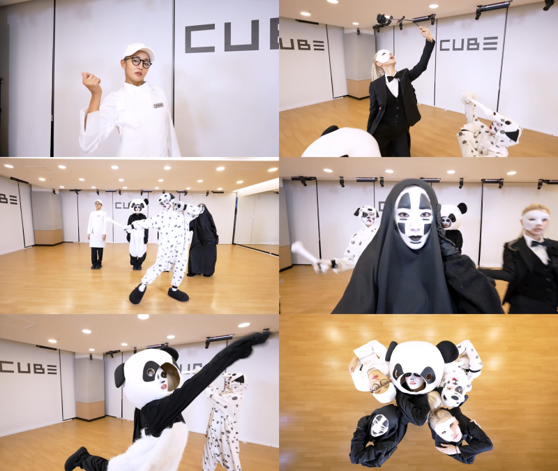 또 소연은 거대한 판다로 변신해 무대 위 카리스마 있는 모습과는 사뭇 다른 매력을 드러냈다. 우기는 과거 ‘슈퍼 레이디’ 뮤직비디오를 떠올리게 하는 달마시안으로 분장해 이목을 집중시켰고, 슈화는 애니메이션 ‘센과 치히로의 행방불명’ 속 캐릭터 가오나시로 등장해 특유의 애티튜드를 유지하며 존재감을 뽐냈다.