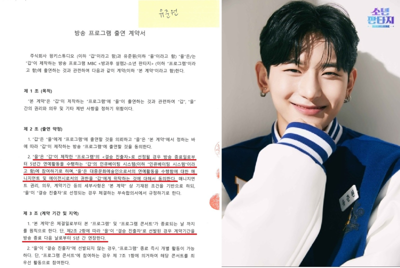 펑키스튜디오에 따르면, 계약서에는 ‘을은 갑이 제작한 프로그램의 ‘결승 진출자’로 선정될 경우 방송 종료일로부 터 5년간 연예활동을 수행하는 갑의 인큐베이팅 시스템(이하 인큐베이팅 시스템이라 고 함)에 참여하기로 하며, 을은 대중문화예술인으로서의 연예활동을 수행함에 대한 매 니지먼트 및 에이전시로서의 권한을 갑에게 위탁하는 것에 대해서 동의한다’는 내용과 ‘을이 프로그램의 결승 진출자로 선정될 경우 방송 종료일로부터 5년간 연예 활동을 수행한다’는 내용이 기재돼 있다.