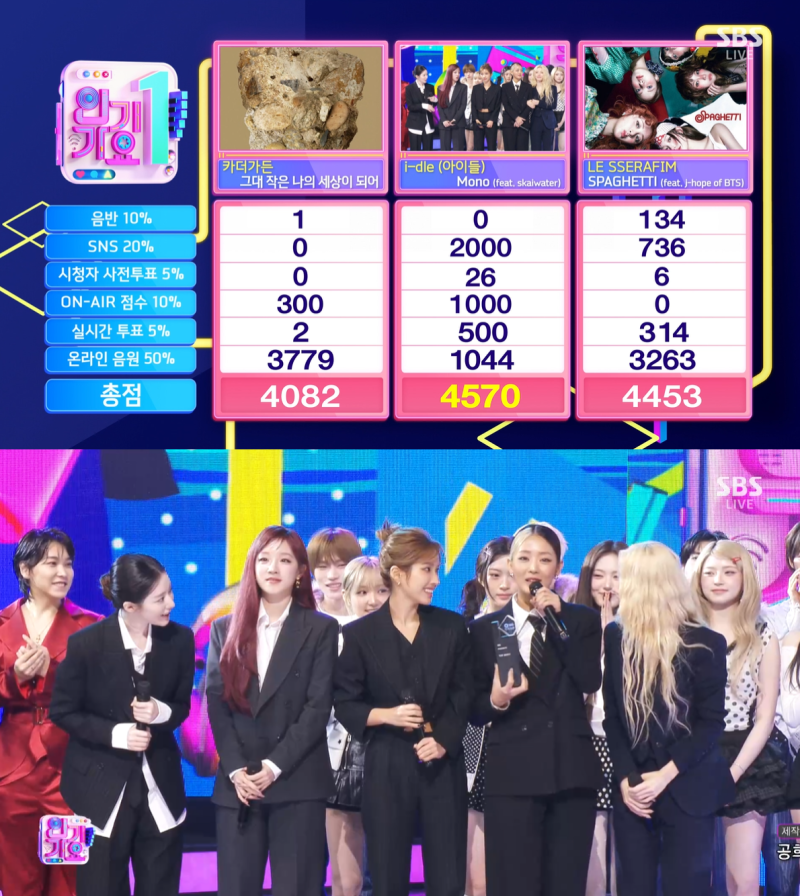 8일 방송된 SBS 가요프로그램 ‘인기가요’에서는 카더가든의 ‘그대 작은 나의 세상이 되어’, 아이들의 ‘모노’, 르세라핌의 ‘스파게티’(SPAGHETTI)가 1위를 놓고 경쟁했다.