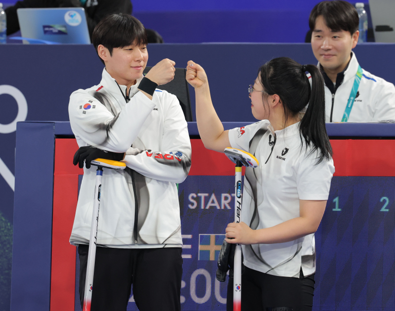 주먹 맞대는 김선영-정영석. 사진=연합뉴스 컬링 믹스더블의 김선영(강릉시청)-정영석(강원도청) 조가 2026 밀라노·코르티나 동계올림픽에서 5연패 뒤 3연승을 달렸다. 다만 남은 경기 결과와 관계 없이 준결승 진출은 좌절됐다.