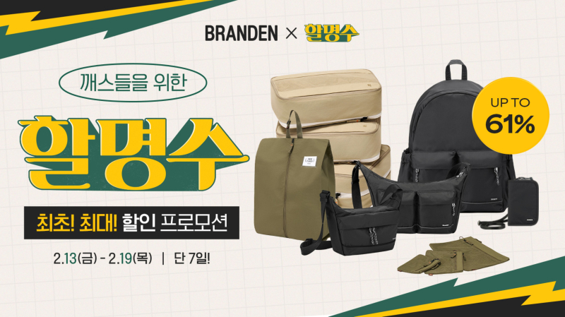브랜든과 함께한 ‘깨스마켓’ 첫 회차 콘텐츠는 2월 13일 할명수 유튜브 공식 채널을 통해 공개된다. 콘텐츠 공개와 함께 브랜든 제품을 최대 61% 할인된 가격으로 만나볼 수 있는 프로모션도 진행되며, 프로모션 기간은 2월 19일까지 총 7일간이다. 자세한 내용은 브랜든의 공식 SNS 채널과 할명수 유튜브 공식 채널로 확인할 수 있다.