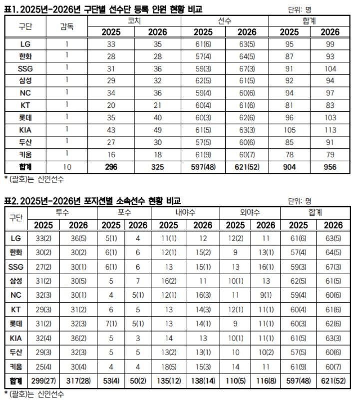 2026 신인 선수는 총 52명으로 2025년 48명보다 4명 증가했다. 신인 선수 중에서는 투수가 28명(53.9%)으로 가장 많았다. 뒤이어 내야수 14명, 외야수 8명, 포수 2명 순으로, 야수는 총 24명이었다. 10개 구단 중에서는 키움이 가장 많은 7명의 신인을 등록했다. 감독을 포함한 코칭스태프 숫자는 지난해 307명보다 28명 증가한 335명. KIA는 가장 많은 50명의 코칭스태프를 등록했다.