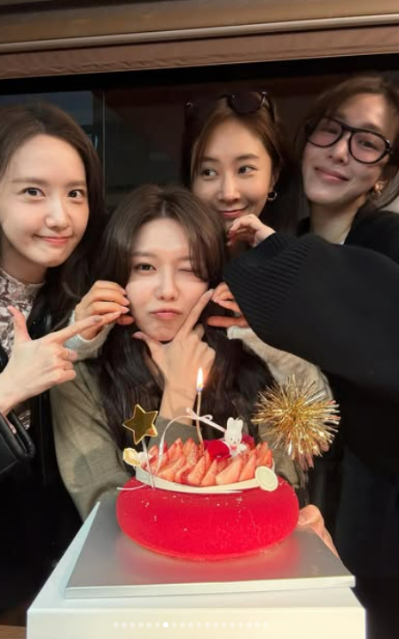 특히 이번 생일 파티에는 윤아, 유리, 티파니, 서현 등 소녀시대 멤버들이 총출동했다. 멤버들은 딸기가 듬뿍 올라간 붉은색 케이크를 사이에 두고 수영의 볼을 찌르거나 장난스러운 포즈를 취하며 20년 가까이 이어져 온 끈끈한 의리를 보여주었다.